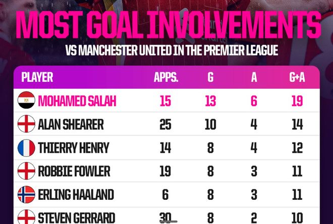 在过往的交锋中,曼联可以说是利物浦球星萨拉赫“最喜欢”的对手之一,截至目前他已在英超联赛中对阵曼联15次,总计打入13粒进球,贡献6次助攻,进球数与制造进球数均为英超历史第一。